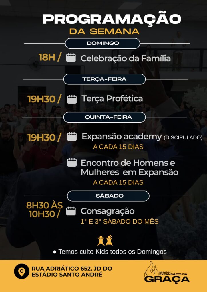 Cultos e Reuniões: Nossos cultos são centrados na adoração, na pregação da Palavra de Deus e na oração. Além dos cultos dominicais e de meio de semana, oferecemos encontros nos PONTOS DE EXPANSÃO, seminários e eventos especiais para discipulado e comunhão.